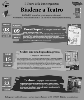 Tre spettacoli per quattro serate di teatro e buon umore in compagnia di compagnie FITA: è "Biadene a Teatro", rassegna promossa da Il Teatro delle Lune che si terrà tra l'8 e il 22 novembre nei giorni di sabato ore 21 presso la sala parrocchiale di fianco alla chiesa di Biadene, frazione di Montebelluna, in provincia di Treviso.