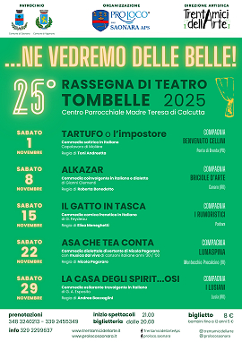 Sarà un novembre di risate grazie al teatro amatoriale portato sul palcoscenico dalla rassegna "Ne vedremo delle belle", giunta alla sua 25sima edizione e forte della direzione artistica della compagnia Trentamici DellArte Aps. Dall'1 al 29 novembre, cinque commedie eclettiche ma unite dalla voglia di intrattenere con gusto. Gli spettacoli si svolgeranno presso il Centro Parrocchiale Madre Teresa di Calcutta di Tombelle (provincia di Padova) sempre alle ore 21.