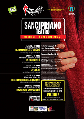Sabato 4 ottobre presso la Sala Parrocchiale di San Cipriano di Roncade (provincia di Treviso), prenderà il via la 21sima edizione di Sancipriano Teatro, rassegna amatoriale organizzata dalla compagnia TeatroRoncade con il contributo della Pro Loco Roncade, dei volontari del Gruppo Festeggiamenti di San Cipriano e il sostegno di tante attività economiche locali e il patrocinio del Comune di Roncade.