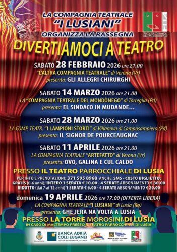 Cinque spettacoli tra febbraio e aprile per “Divertiamoci a Teatro” rassegna organizzata dalla Compagnia I Lusiani. Si parte sabato 28 febbraio con la prima commedia: ogni spettacolo si terrà di sabato alle ore 21 presso il Teatro Parrocchiale di Lusia (provincia di Rovigo), con l’eccezione dello spettacolo di chiusura, “Ghe jera na volta a Lusia”, degli stessi Lusiani, che si terrà domenica 19 aprile ore 17 presso la Torre Morosini, sempre a Lusia (in caso di maltempo presso il Teatro Parrocchiale di Lusia.