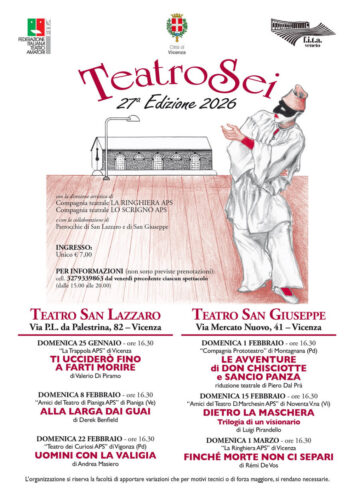 Il nuovo anno teatrale promosso da FITA Vicenza inizia all’insegna del buonumore e della qualità con Teatrosei – una delle manifestazioni annuali insieme a Teatro Popolare Veneto, Teatro in Giardino e Invito a Teatro, organizzate dal comitato provinciale di FITA; la rassegna, realizzata con il patrocinio del Comune di Vicenza e in collaborazione con le parrocchie di San Giuseppe e San Lazzaro, si avvale della direzione artistica delle compagnie vicentine La Ringhiera e Lo Scrigno, le quali hanno ideato un calendario di sei eventi suddivisi tra il Teatro San Giuseppe in via Mercato Nuovo 41 e il Teatro San Lazzaro in via da Palestrina 82, tra gennaio e marzo 2026, tutti affidati a compagnie venete appartenenti alla famiglia FITA.